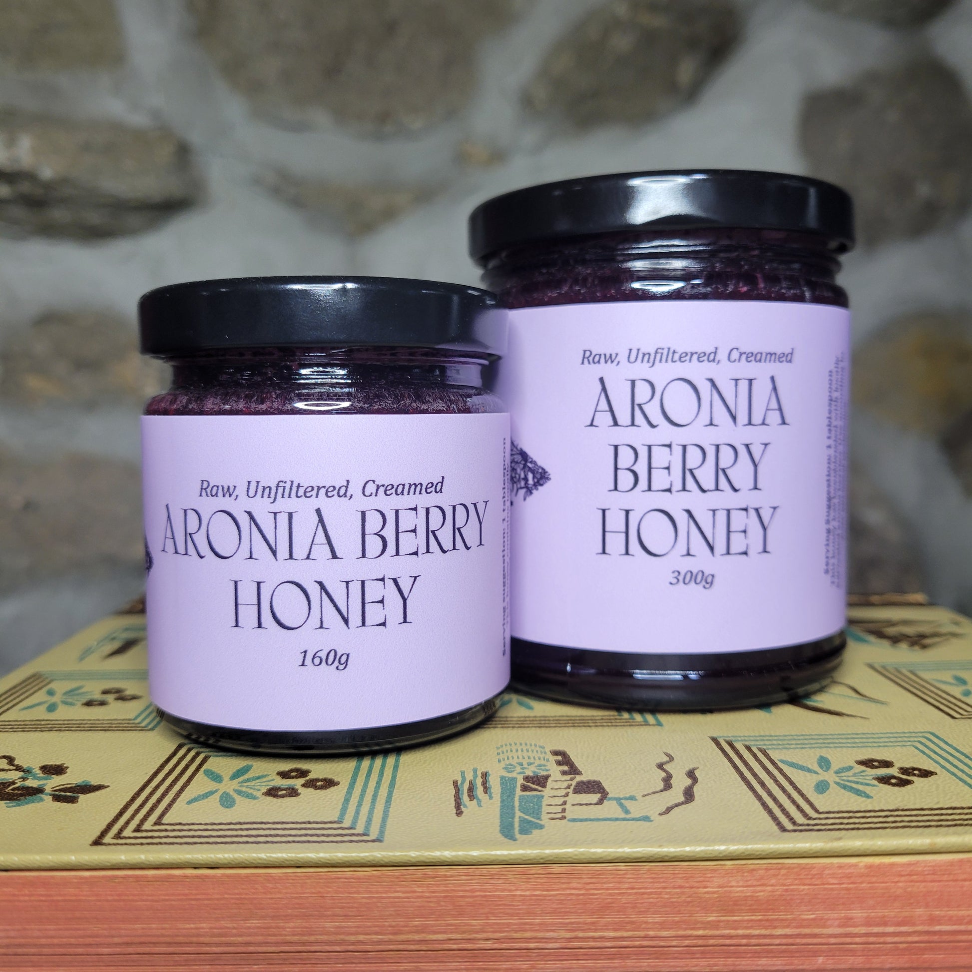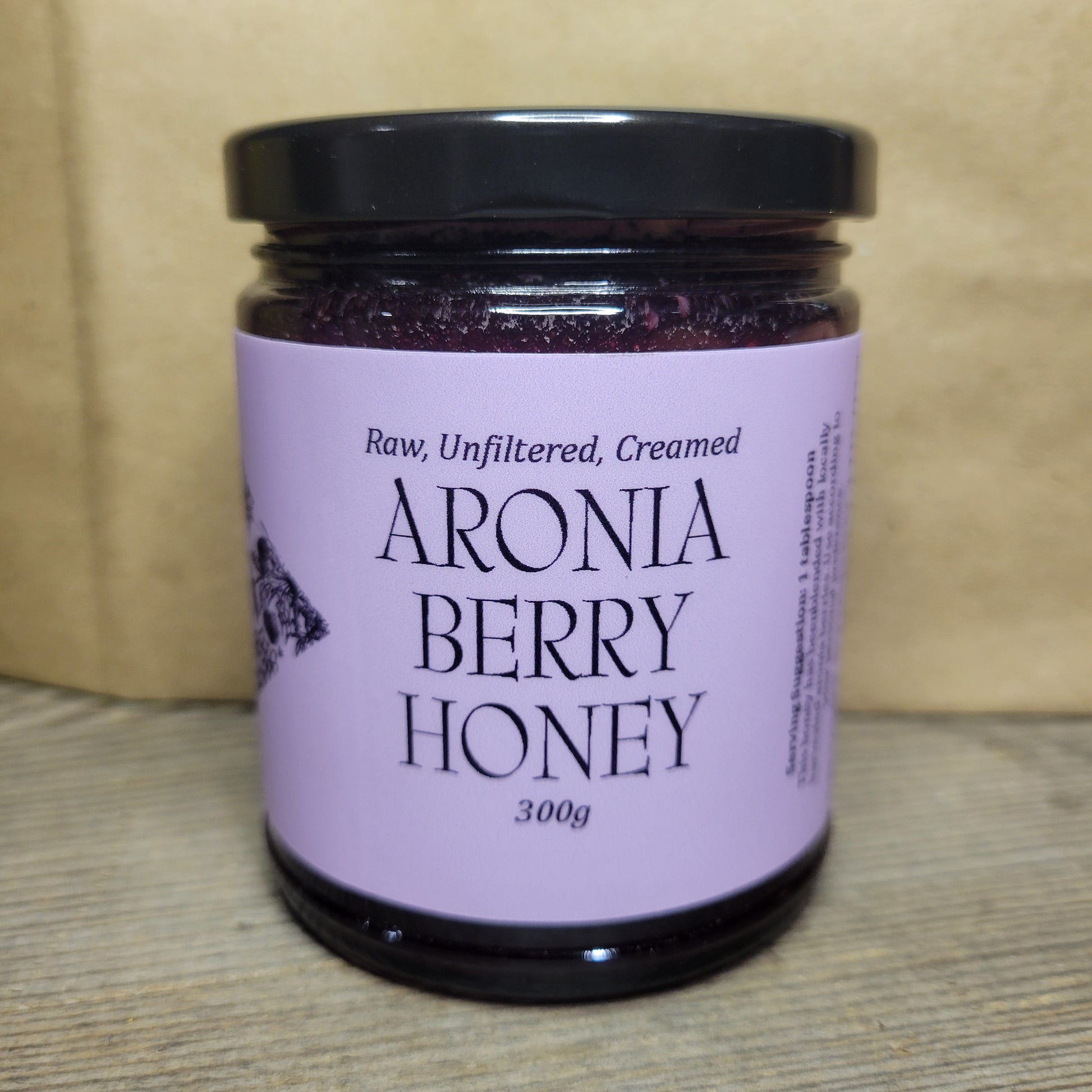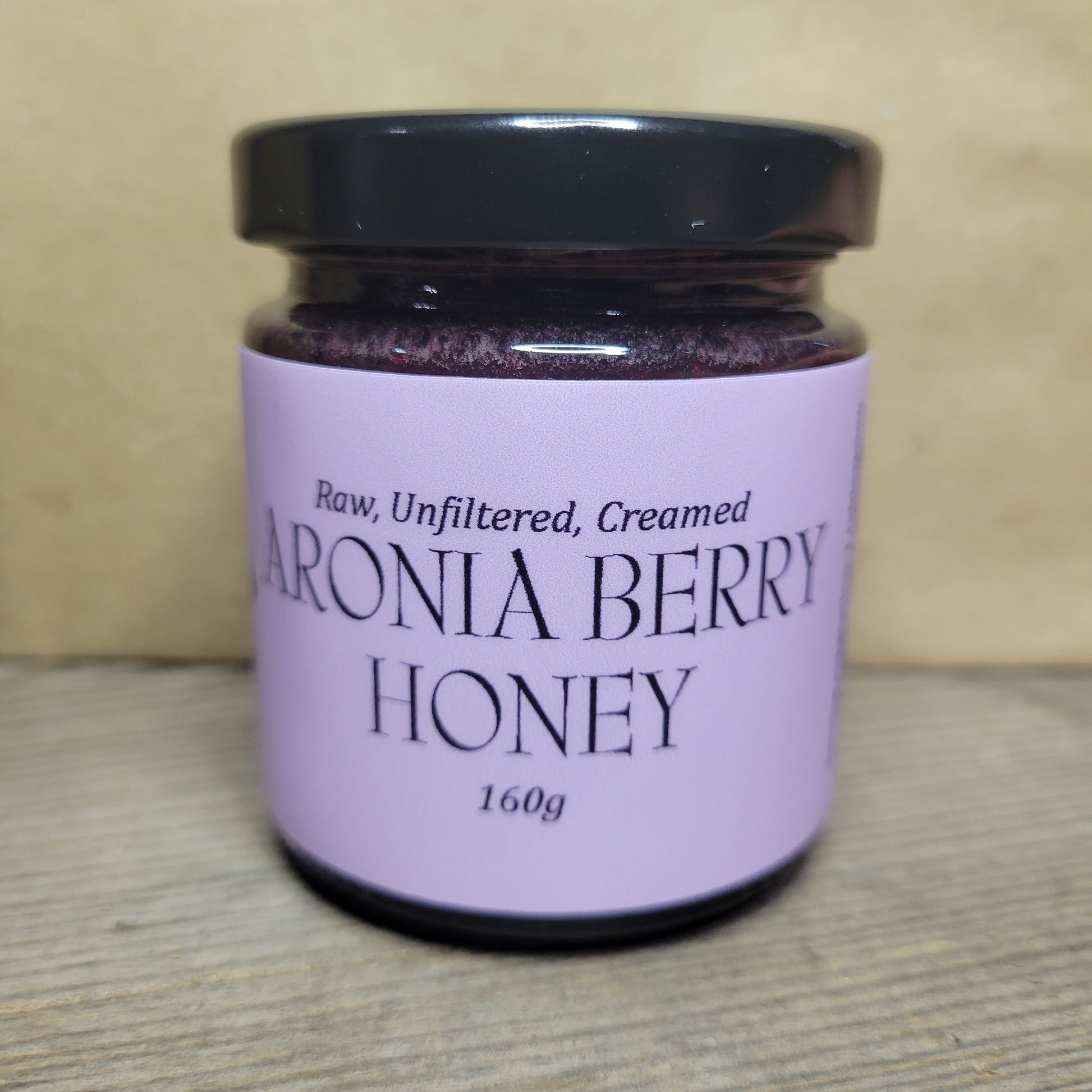 Aronia berries offer up a plethora of health benefits including fiber, vitamin C, and powerful antioxidants, so it’s a lovely healthy option when blended into raw creamed honey! Fresh raw Aronia berries are quite tannic and have a mouth-drying effect, but that didn't transfer to the creamed honey and it has a very jammy, delicious flavour.