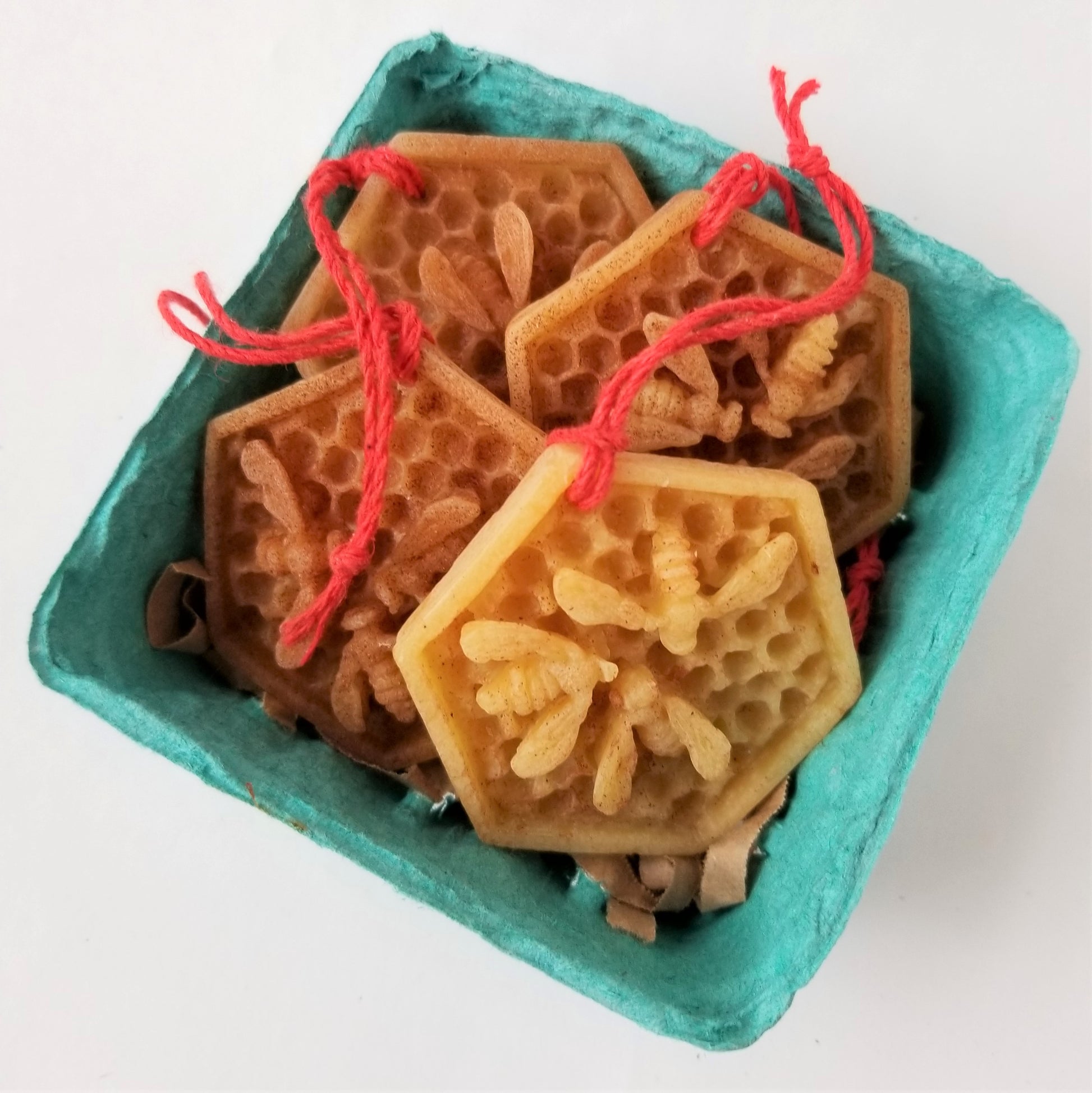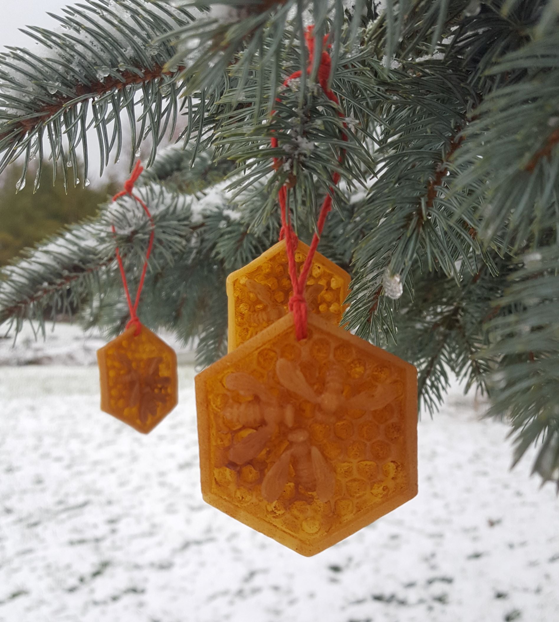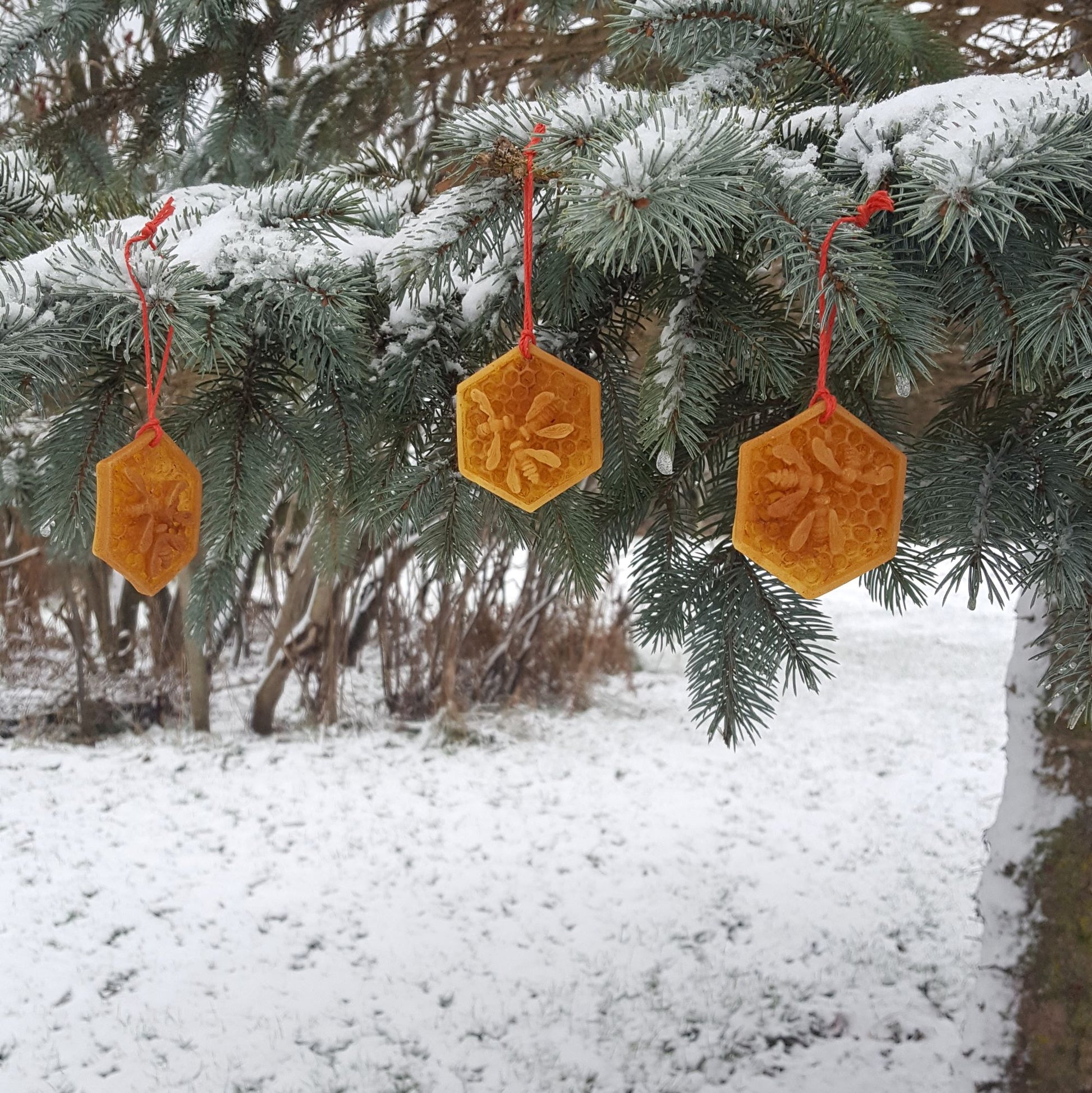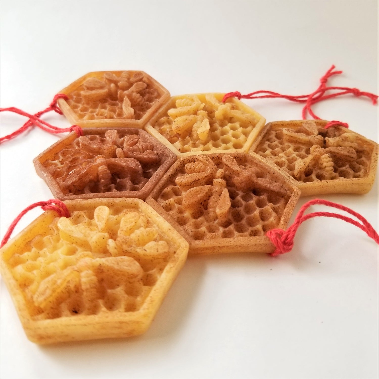 These lovely little hexagon ornaments are adorned with three worker bees on honeycomb and coated with cinnamon for a delightful color and subtle honey-cinnamon aroma. Each one is carefully strung on red cord and will make a stunning addition to your winter decorations, whether placed amidst greenery or illuminated with white string lights on your Christmas or Yule tree.