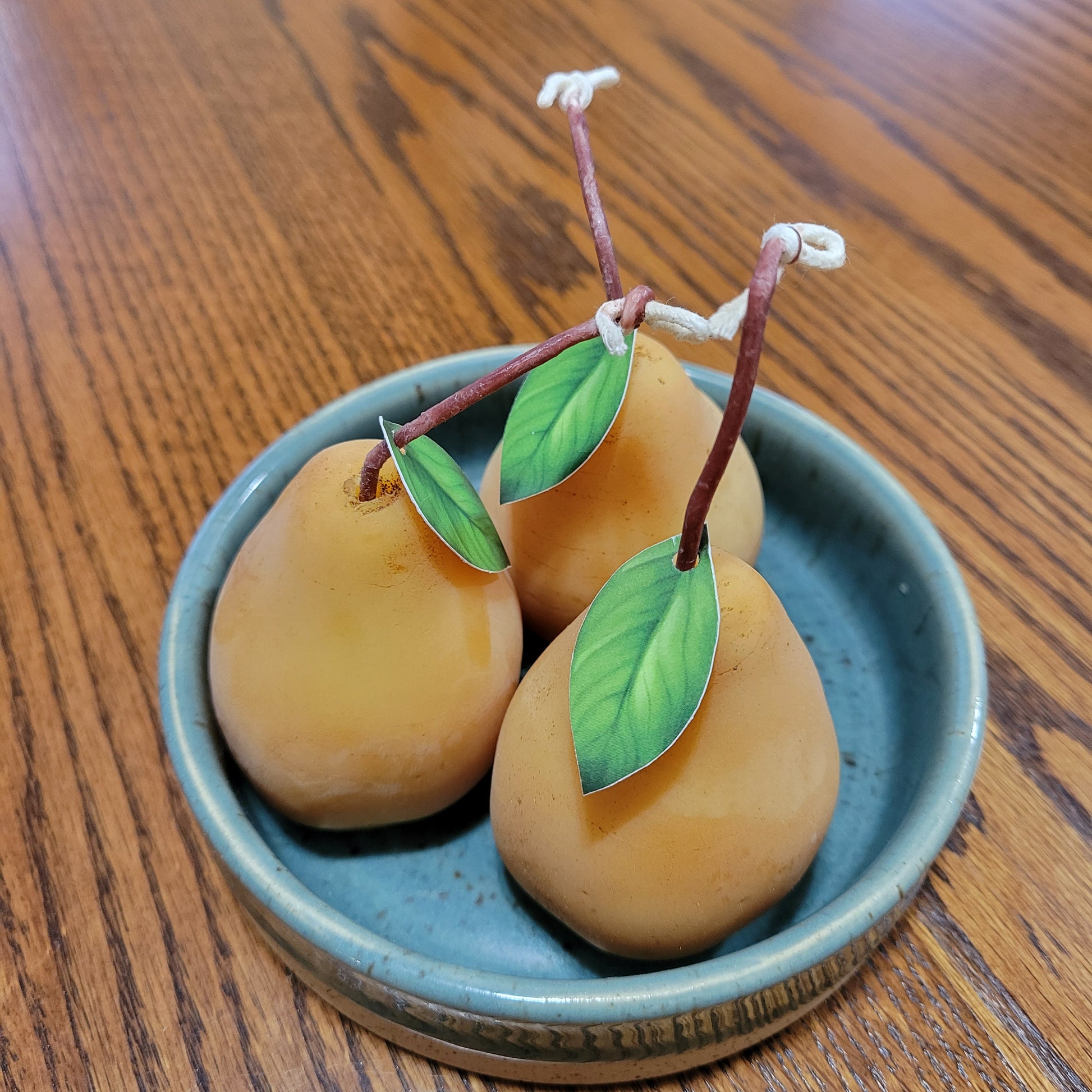 The mold for these candles was made from a Bonne Louise de Jersey pear on a tree right beside some of my beehives. Each pear is rubbed with cinnamon to give a textured, realistic effect, and little leaf tags add the final touch.