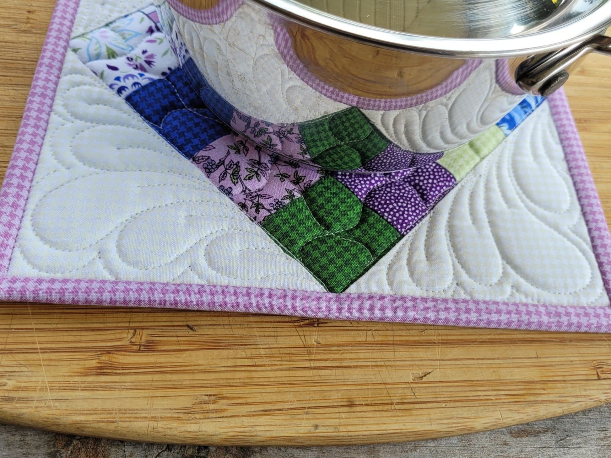 I use leftover scraps of fabrics to create these patchwork potholders. Sizes vary somewhat depending on pattern used. They will fall in the 8-9 inch square range (about 23 cm). Photos show the mats with a small size saucepan for reference.