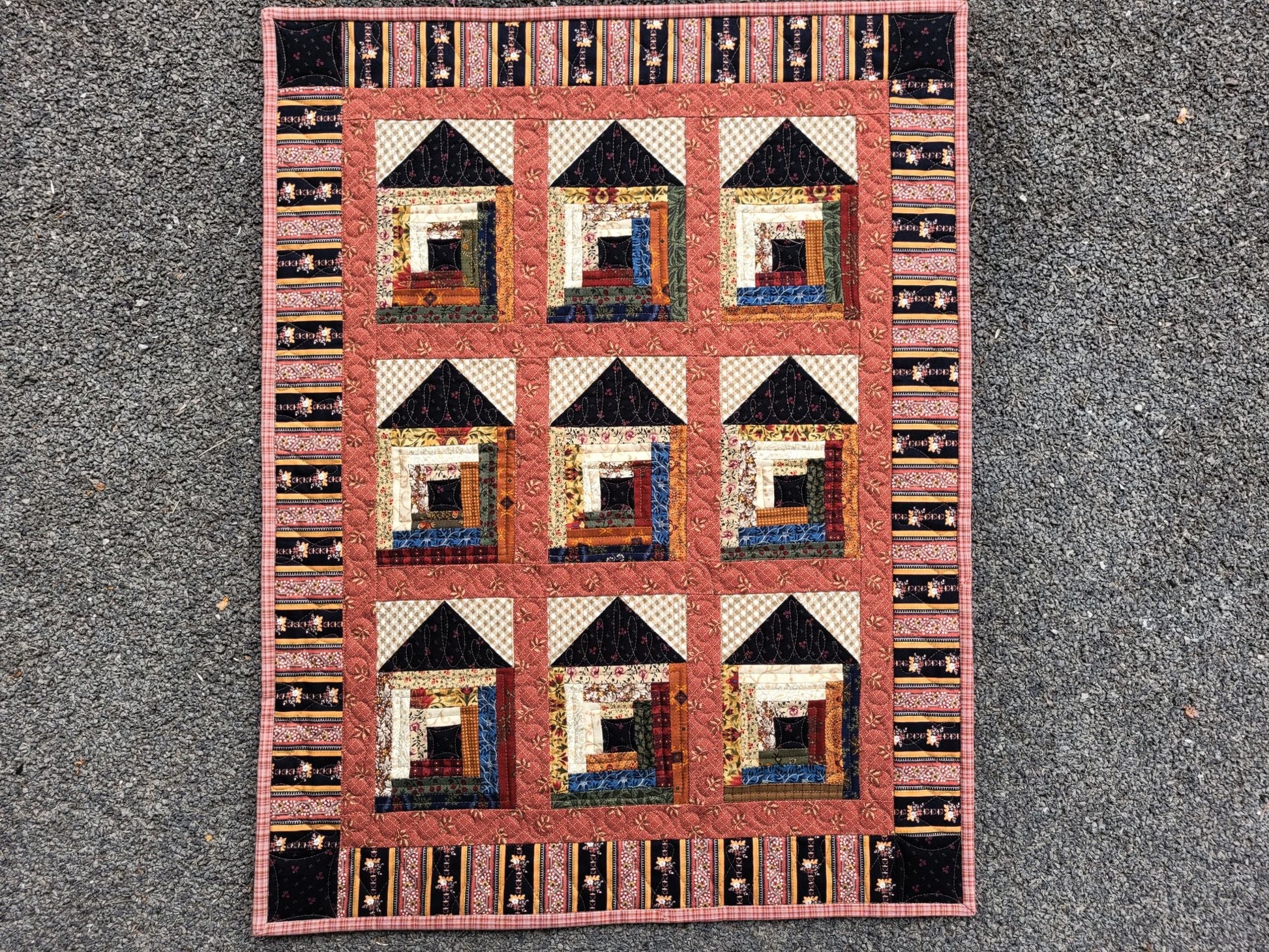 This charming little Soddy House quilt is chock-full of rustic charm. Lovely scrappy fabric choices make this a one of a kind decor item. Quilting texture is done by freemotion, using various designs thorough out the elements of the quilt.