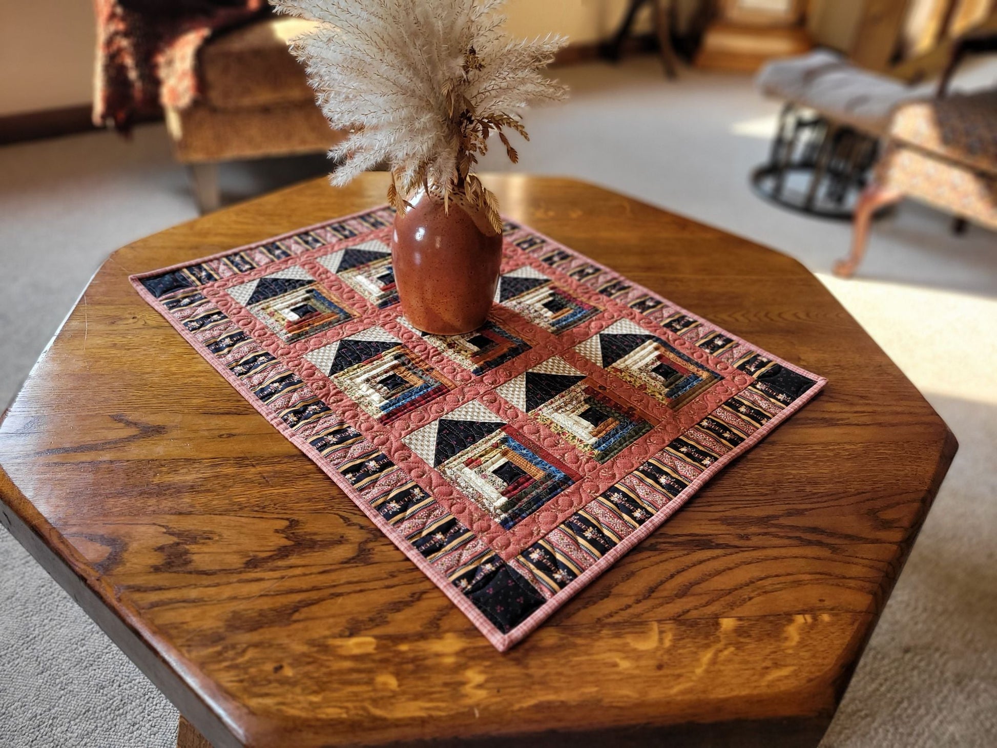 Whether used on the tabletop or hung on the wall, this mini quilt is wonderful for cozy fall, country farmhouse decor.