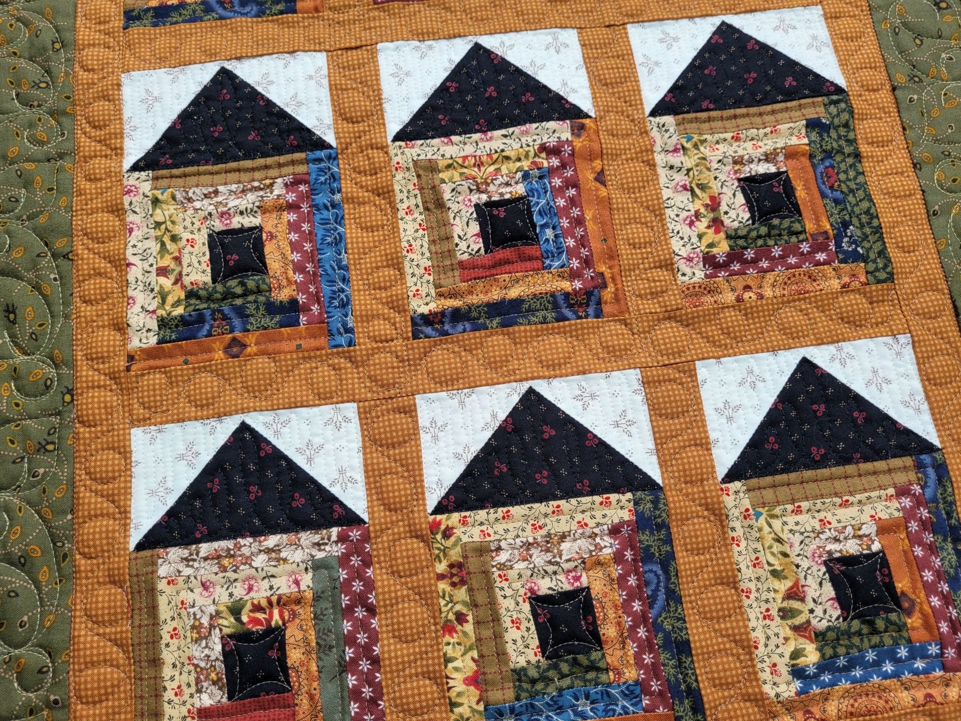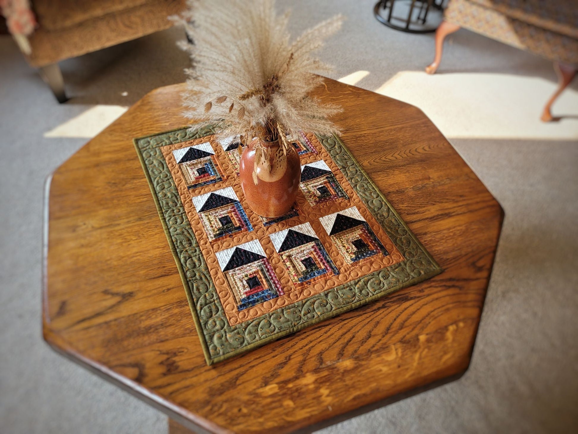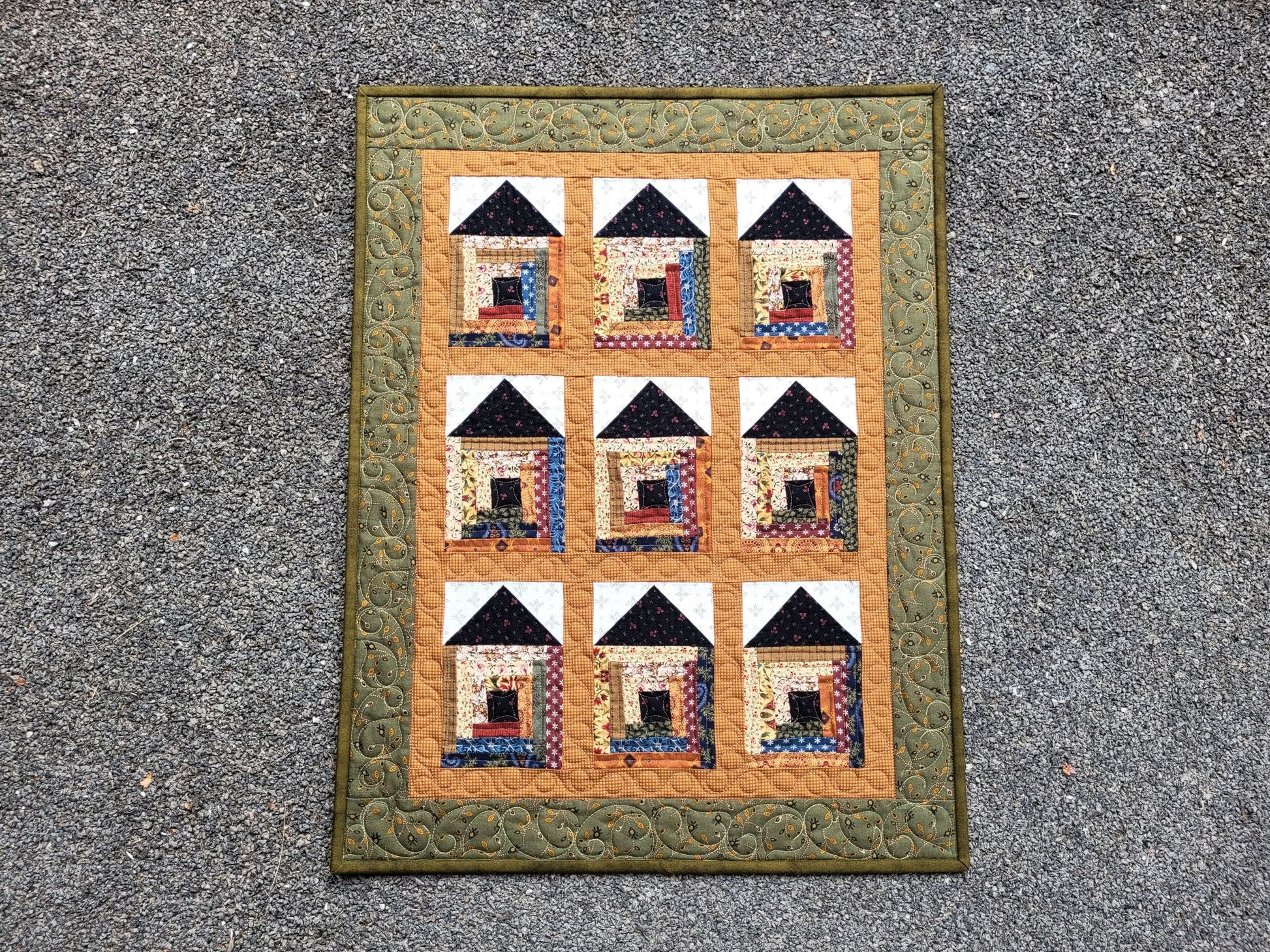 This charming little Soddy House quilt is chock-full of rustic charm. Lovely scrappy fabric choices make this a one of a kind decor item. Quilting texture is done by freemotion, using various designs thorough out the elements of the quilt.