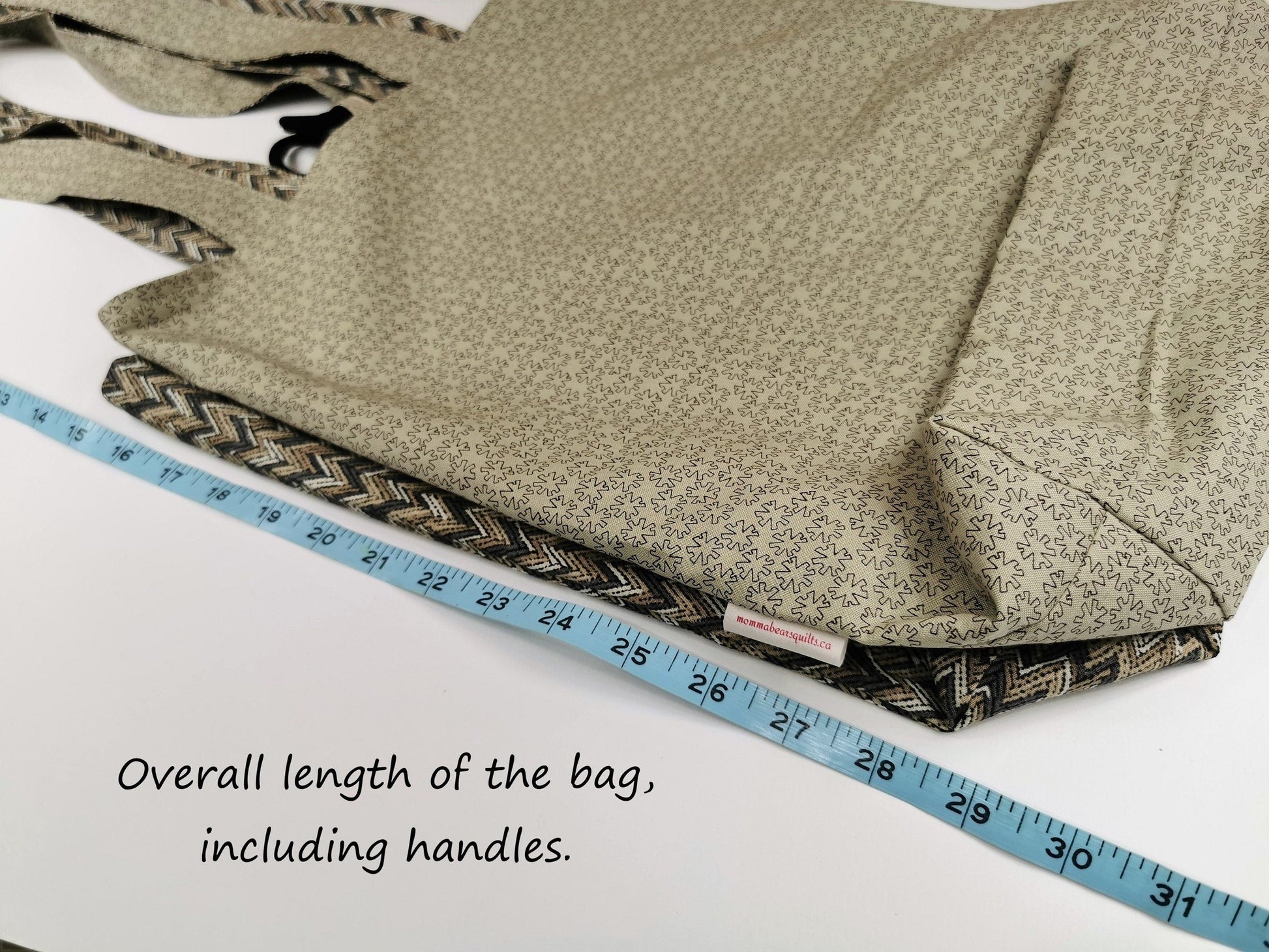 - sturdy, cotton webbing handles, measuring over 33 inches long; so that the bag will hang about 15 inches down from your shoulder