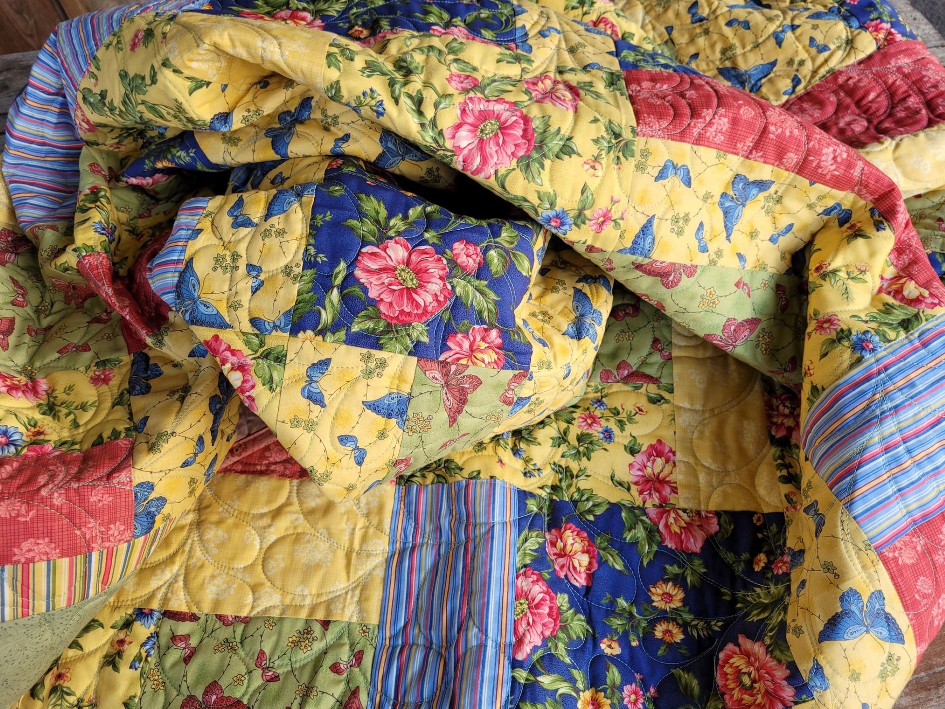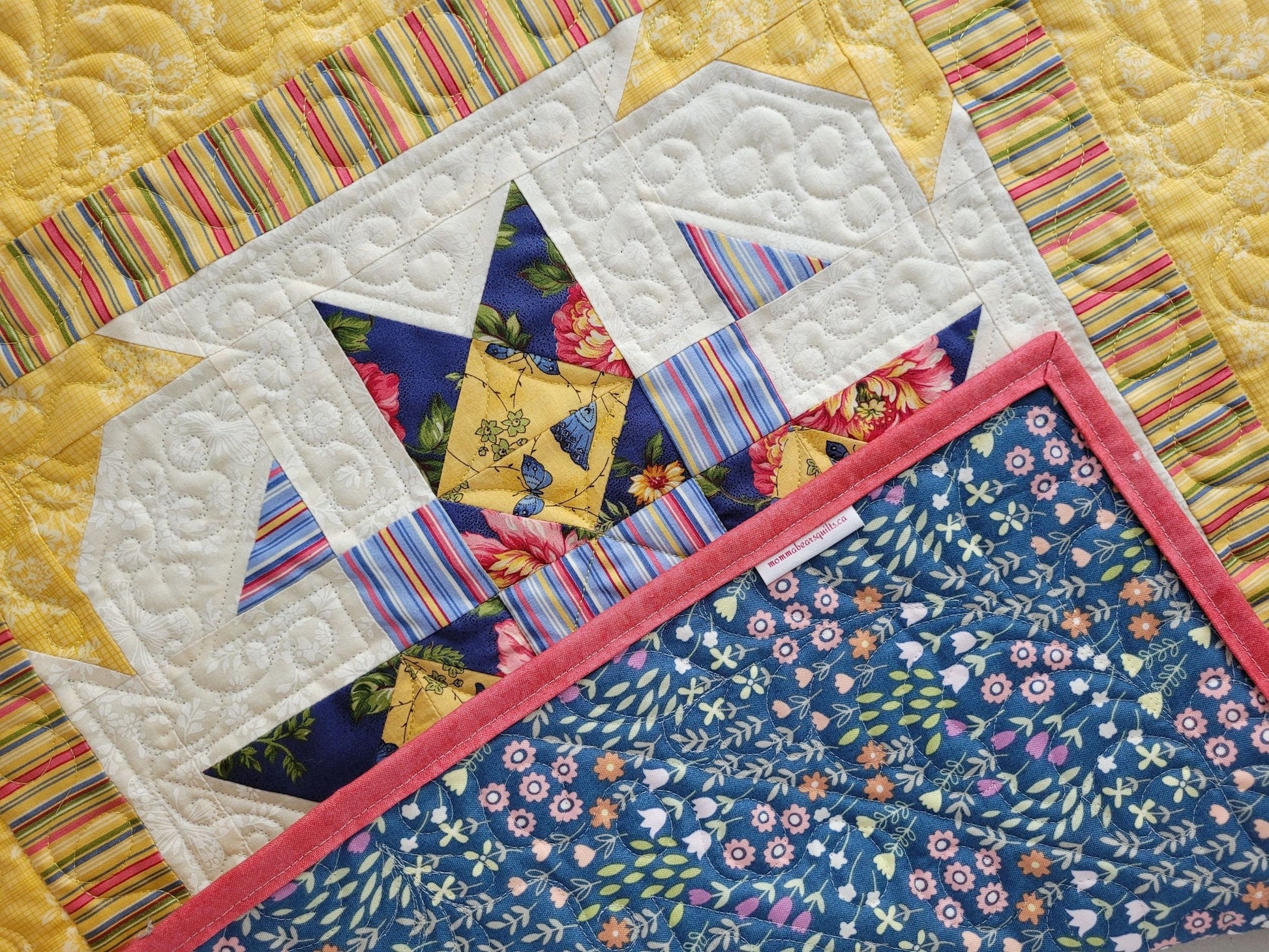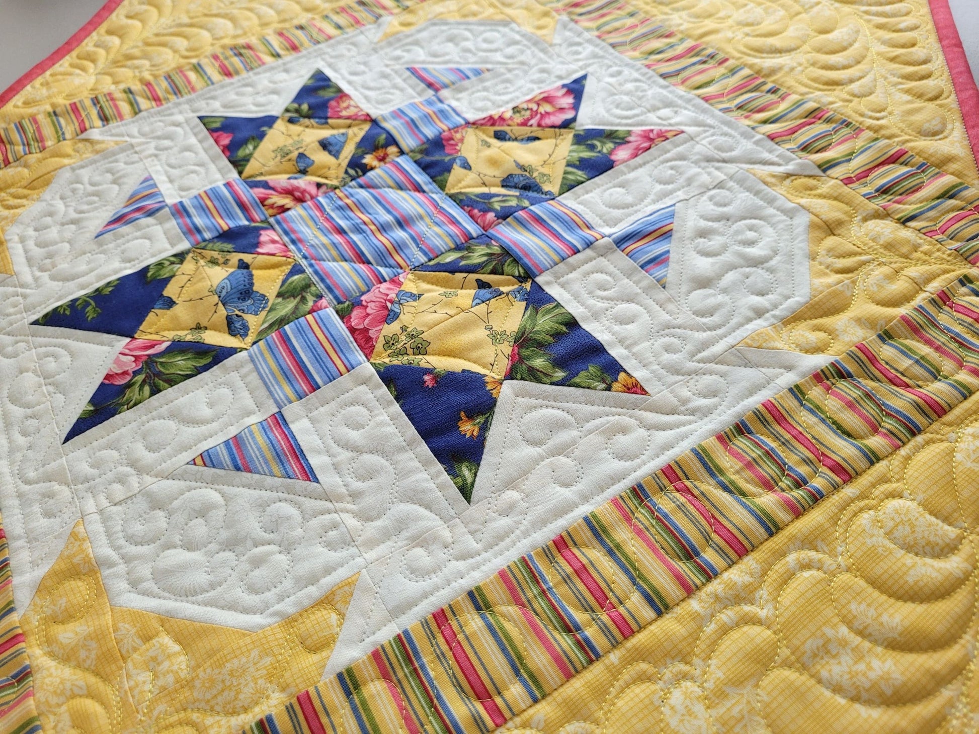 Brighten your decor this summer with a beautiful quilt! This yellow star quilted table topper can also be used as a wall hanging. A unique, one-of-a-kind quilt that was improvisational as I was trying to make the most of the last remaining scraps of this gorgeous floral fabric collection. A special feature is the custom quilting that adds texture and interest.